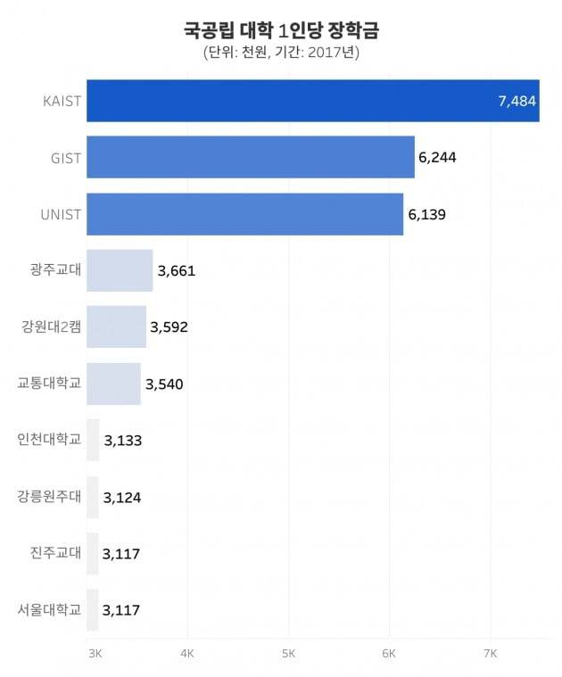 국공립 대학 중 1인당 장학금이 가장 높은 곳은 카이스트, 한국과학기술원입니다. 서울 13개 대학 중 장학금 6위를 차지한 서울대는 국·공립 학교로만 보면 10위입니다.