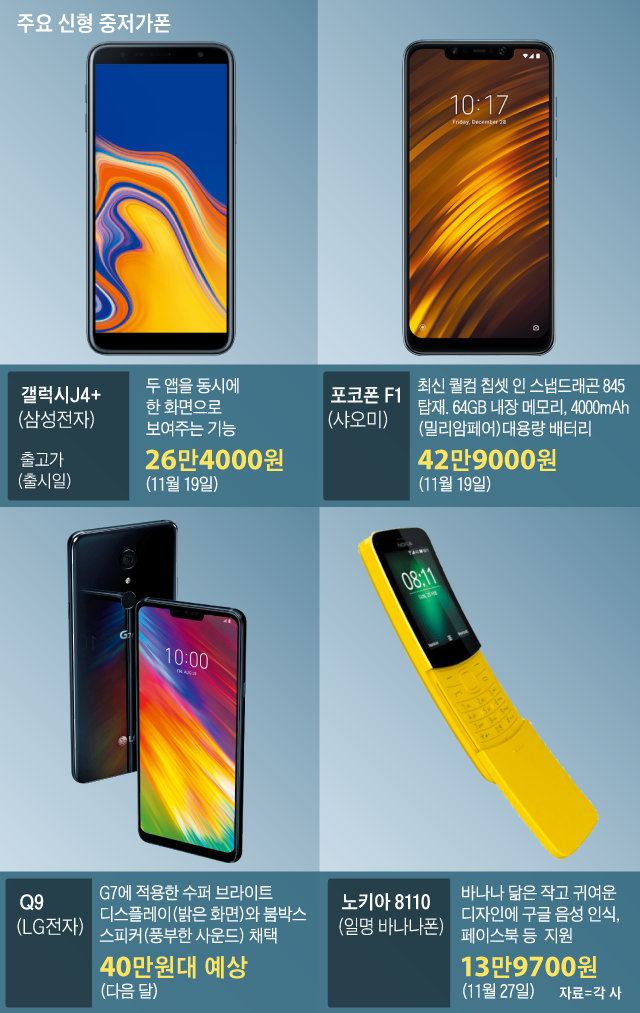 샤오미·화웨이 등 중국 업체의 중저가 시장 공세도 만만치 않다. 샤오미는 19일 통신 3사를 통해 40만원대 '포코폰 F1'을 출시한다. 중국산 스마트폰이 통신 3사에서 동시에 출시되는 건 이 제품이 처음이다. 스마트폰 두뇌에 해당하는 칩셋으로 주로 프리미엄폰에서 쓰이는 퀄컴 스냅드래곤 845를 탑재했다. 저장 메모리(64기가바이트)와 배터리 용량(4000밀리암페어)도 프리미엄급이다. 화웨이는 KT와 함께 지난달 30만원대 '비와이폰3'를 출시했다. 후면에 1600만·200만 화소의 카메라 2개를 탑재했다.