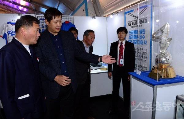 명예의 전당에서 이대호와 오규석 기장군수가 프리미어 12 우승 트로피를 살펴보고 있다.