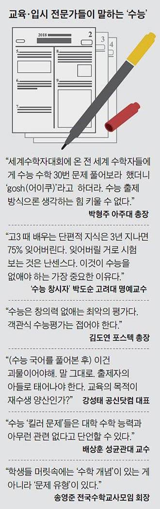 올해 수능이 끝난 지 나흘이 지났지만 시험을 둘러싼 논란이 수그러들지 않고 있다. 동서양 우주론과 만유인력·질점 등에 대한 국어 31번이 지나치게 어렵게 출제돼 수험생들을 당황하게 했는데, 이 문제가 수능 전반에 대한 논란으로 이어지고 있다. 대학 총장과 교육·입시 전문가들도 "수능의 킬러 문항(최고난도 문제)은 대학 수학 능력과는 아무런 관련이 없다" "교육의 목적이 재수생 양산이냐"고 공개적으로 비판하고 나섰다. 교육계는 "수능이 상위권 학생을 변별하기 위한 목적으로 지나치게 어려운 문제를 출제하면서 교사들도 풀지 못하는 '괴물'이 되어버렸다"고 지적한다.