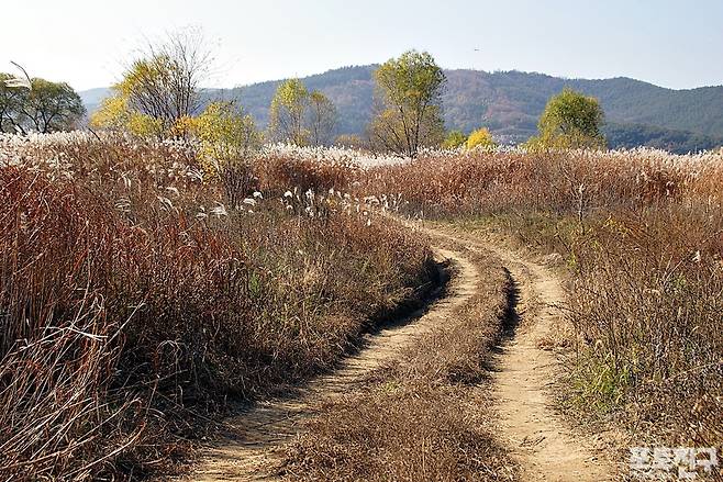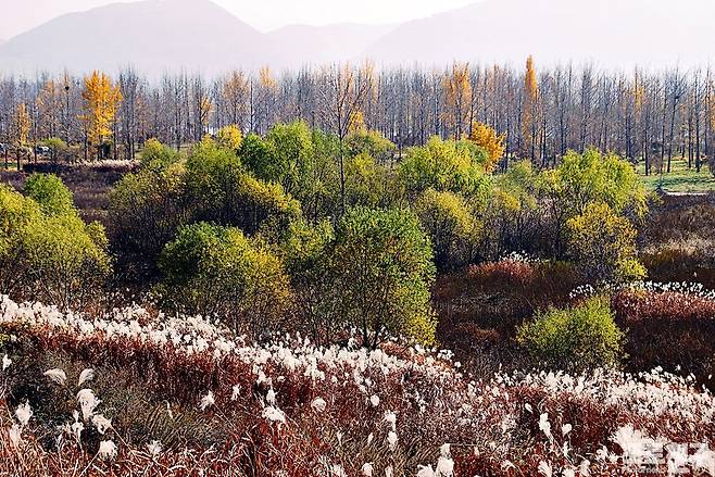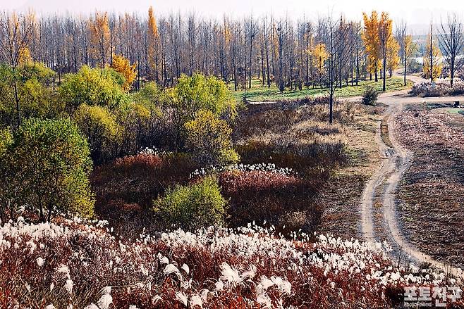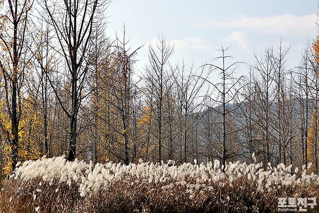 하얀 억새와 노란 잎 떨어진 앙상한 은행나무의 풍경이 눈길을 끄네요.