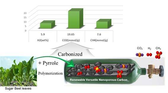 오현철 교수와 Nour F. Attia 박사 연구팀은 버려지는 폐 바이오 물질(사탕수수 잎)을 판상형의 흑연 플레이크(Flakes)로 탄화한 뒤, 폴리머(polypyrrole) 나노입자를 화학적 반응으로 증착하는 방식으로 ‘비표면적’ 증가 및 ‘다양한 기체와의 흡착에너지’를 향상하는 데 성공했다.