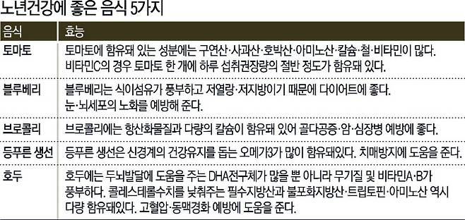 이와 함께 나이 들면서 골다공증·변비가 생길 수도 있다. 따라서 노년층은 단백질과 각종 비타민을 충분히 섭취해야한다. 한국영양학회에 따르면 65세 이상 남성의 경우 하루 70g을, 여성의 경우 하루 60g을 섭취해야한다.