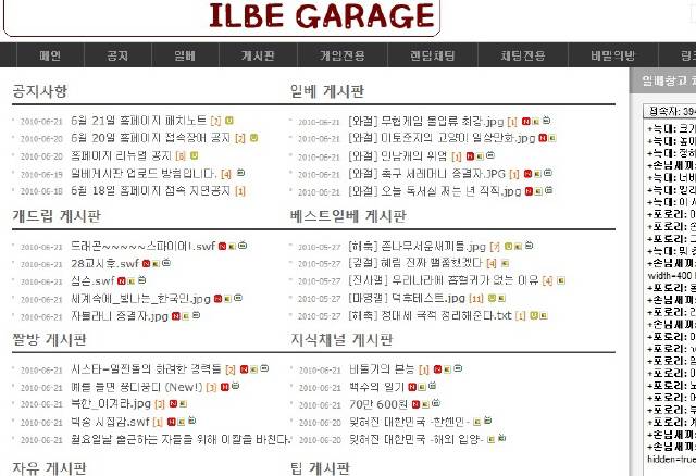 기존의 '일베저장소'가 잠시 서버를 닫고 있을 때, 'ilbe garage' 라는 새로운 사이트가 등장한다. 이 사이트가 지금의 '일베저장소'까지 이어진다. 당시 대부분의 콘텐츠는 디시인사이드의 베스트 게시물로 채워졌다.