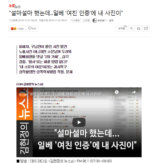 11월 18일 새벽부터 여성을 불법촬영한 일명 '여친인증' 사진이 대거 업로드. 노출이 심한 사진이 상당수였는데, 대부분 모자이크조차 제대로 되어있지 않았다. 댓글을 통해 2차가해도 활발히 이뤄졌다. 일베의 이런 행위는 이전부터 꾸준히 있어왔는데, 사실상 이번에 처음으로 공론화가 됐다고 볼 수 있다. 전문가들은 대체로 이런 행위의 기저에 과시욕과 인정 욕구가 자리하고 있다고 보고 있다.
