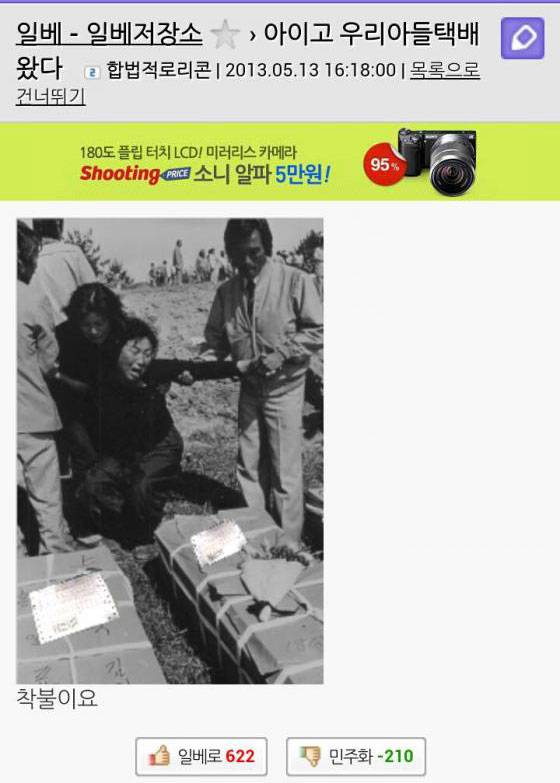 5·18 민주화운동 희생자 시신이 담긴 관을 '홍어 택배'로 표현하며 비하. 이후 이 글을 작성한 일베 유저는 유족에게 고소당했다.