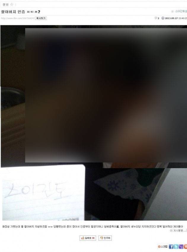사망한 할아버지의 사진을 찍어 올리며 '당황했는데 종이 찾아서 인증부터 할 생각하니 일베 중독'이라는 글을 작성.