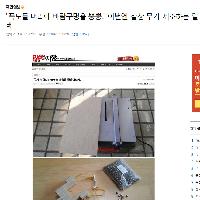 MDF(중밀도 섬유 합판)과 기계톱을 이용해 새총과 유사한 무기를 만드는 과정을 설명. 이 글에는 쇠구슬이 합판 등을 뚫는 모습도 함께 담겼다. 일베의 몇 이용자마저 "도가 지나쳤다"는 댓글을 달며 비판했으나, 글 작성자는 "마트에서 식칼도 구입하는데 지장 없다"는 반응을 보였다.