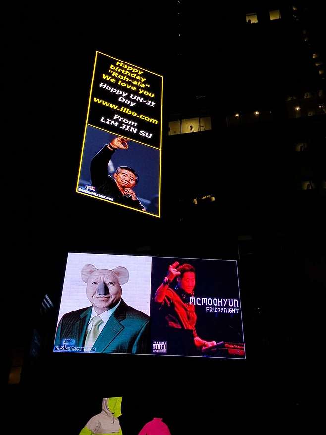 한 일베 회원이 뉴욕 타임스퀘어에 노무현 전 대통령 비하 광고를 게재. 기사화되며 논란이 커지자 해당 광고업체는 광고를 내리고 해당 광고가 진짜 생일 축하메세지라고 생각해 송출했다는 사과를 광고판에 게재했다.