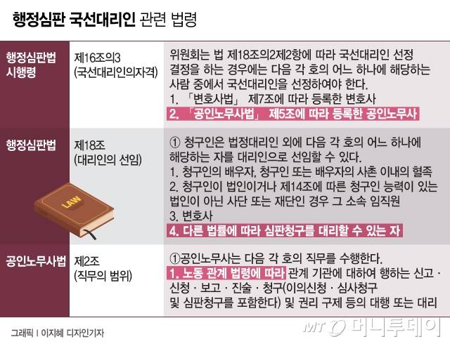 개정된 시행령에 따라 국선대리인에 선정될 수 있는 자격사는 '변호사'와 '노무사'다. 이에 변호사업계 일각에선 노무사가 '전체' 행정심판에서 변호사와 함께 국선대리인 역할까지 하는 것 아니냐고 우려하고 있다.