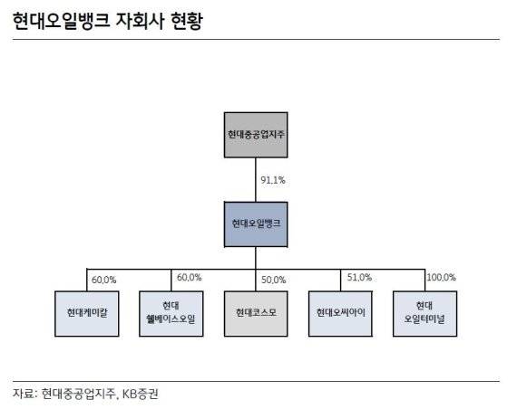 정동익 연구원은 "현대중공업지주가 지분율 91.1%를 차지하는 현대오일뱅크의 상장이 본격화될 것으로 전망된다"며 "KB증권이 추정한 적정시가총액은 8조원 수준"이라고 말했다.
