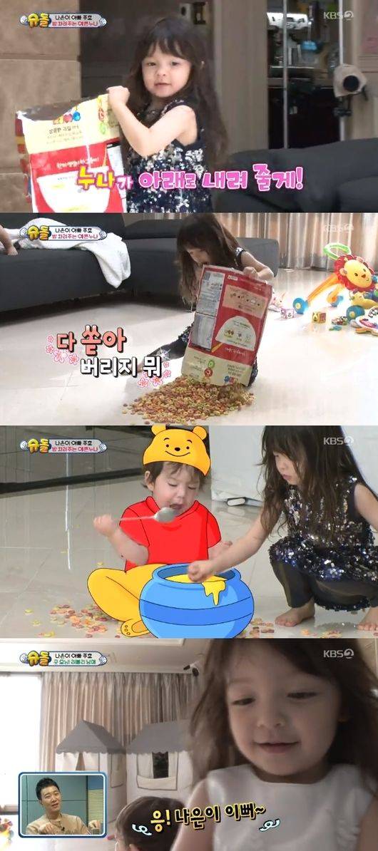 나은은 건후의 기저귀까지 갈아주는 것은 물론 시리얼을 주며 나름의 방법으로 의젓한 누나의 면모를 드러냈다. 그러면서도 동생을 위해 바닥에 시리얼을 모두 뿌리는 천방지축 면모로 모두를 폭소케 했다.