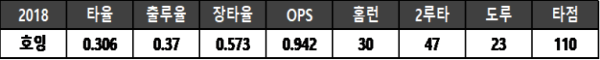 후반기 부진의 원인만 해결한다면 내년에도 호잉을 한국 무대에서 보는 일은 어렵지 않아 보인다. 여름 이후 부쩍 체력 문제를 호소한 호잉은 9월과 10월 각각 OPS 0.789와 0.405를 기록하며 부진의 늪에서 빠져나오지 못했다. 안타 생산은 물론 특유의 장타력마저 사라진 배경에 체력 문제를 빼놓을 수 없다. 142경기 590타석을 쉼 없이 치고 달리며 시즌 동안 체중 10kg을 잃어버린 문제를 반복하지 않으면 내년엔 더 나은 성적을 기대할 수 있다.