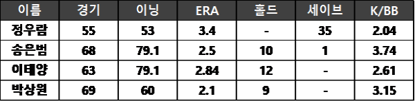 리빌딩으로 끝날 것 같았던 시즌은 마운드가 변하면서 반전이 일어났다. 부진으로 서산행을 통보받았던 이태양과 안영명이 구속을 끌어올리고 화려하게 귀환했다. 송은범이 마침내 새 구종 장착에 성공하면서 한화는 순식간에 리그 최강의 필승조를 완성했다. 여기에 평균자책점 0에 도전했던 사이드암 서균과 우완 강속구 투수 박상원, 체인지업을 장착한 장민재가 합류하면서 한화 불펜의 양과 질은 독보적인 수준으로 바뀌었다.