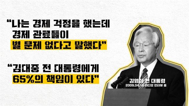외환위기 당시 국가 최고 권력자였던 고 김영삼 전 대통령은 언론 인터뷰에서 경제 위기의 책임을 관료들에게 돌렸습니다. 그리고 관료들, 경제 사령탑이었던 강경식 전 경제부총리와 김인호 청와대 경제수석은 ‘외환위기 환란을 초래한 혐의’로 재판에 넘겨졌지만 무죄를 선고 받았습니다. “일상적인 정책 판단을 처벌하면 우리나라 경제정책 전부가 문제 된다”는 게 무죄 선고의 이유였습니다.