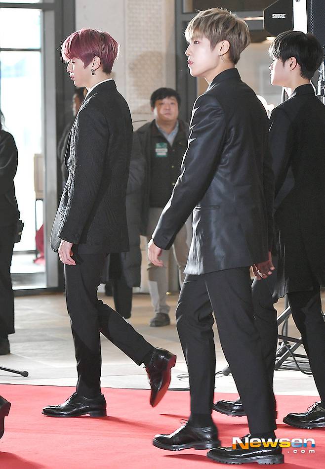 그룹 워너원 강다니엘, 김재환이 11월 28일 오후 인천 영종도 파라다이스시티 특설무대에서 열린 2018 Asia Artist Awards 레드카펫 행사에 참석해 포즈를 위해 입장하고 있다.