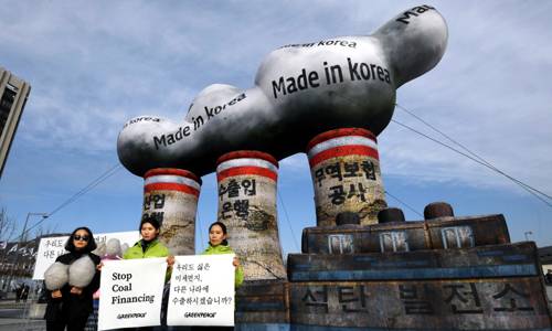 | “미세먼지 원인 석탄발전 투자 중단하라” 국제환경단체 그린피스 회원들이 28일 서울 광화문광장에서 연기를 내뿜는 대형 석탄발전소 모형을 설치해 놓고 정부의 해외 석탄발전소 건설 투자를 중단할 것을 촉구하고 있다. 허정호 선임기자 |