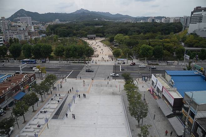 | ▲ 세운상가 3층에서 내려다본 모습 종묘와 연결되는 광대한 신도가 보입니다 |