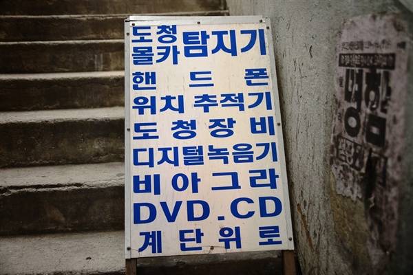 | ▲ 세운상가 입간판 도청장비와 도청탐지기가 창과 방패처럼 모순없이 함께 팔리고 있다 |
