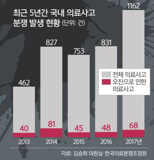 29일 국회 보건복지위원회 소속 자유한국당 김승희 의원이 올해 국정감사에 앞서 한국의료분쟁조정원에서 받은 자료에 따르면 최근 5년간 의료사고 분쟁은 2013년 462건에서 2014년 827건, 2015년 753건, 2016년 831건, 지난해 1162건으로 해마다 증가했다. 이 가운데 오진으로 인한 의료사고 분쟁은 2013년 40건, 2014년 81건, 2015년 45건, 2016년 48건, 지난해 68건 등 매년 평균 57건이었다.