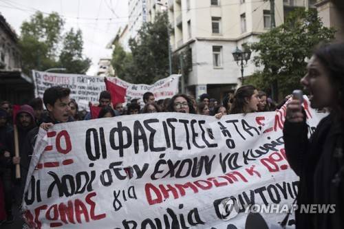 Protesters carry a banner that reads in Greek "fascist out" as students take part in anti-fascist protest in central Athens, on Thursday, Nov. 29. 2018. Protests, mostly against state education policy by usually left-leaning schoolchildren, are common in Greece where all political parties encourage teenagers to be politicized. (AP Photo/Petros Giannakouris)