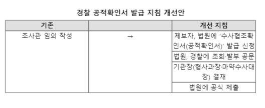 2일 일선 경찰 관계자 등에 따르면 지난 6월 경찰청의 개선 지침 이후 조사관 개인 명의로 작성하던 수사협조확인서(공적확인서) 발부 방식이 기관장의 내부 결재를 통해 법원에 제출하도록 변경됐다.
