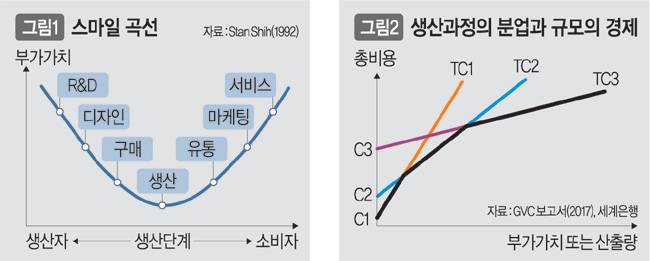 <그림1>은 GVC에서 생산 단계별 부가가치를 보여준다. 26년 전 에이서 컴퓨터 창립자인 대만 출신의 스탠 시(Stan Shih)가 처음 소개한 이 그림은 스마일 곡선(Smiling curve)이라고 부른다. 그는 PC 생산의 가치사슬에서 양쪽 끝 부분의 연구·개발(R&D)과 마케팅이 가장 수익성이 높은 영역이라고 확신했다. 이제 스마일 곡선은 GVC를 상징하는 용어가 됐다.