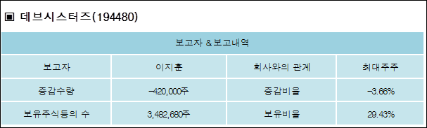[ET투자뉴스][데브시스터즈 지분 변동] 이지훈 외 8명 -3.66%p 감소, 29.43% 보유