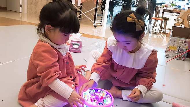 사진 속 첫째 딸 하은 양과 둘째 딸 소은 양은 장난감을 가운데 두고 사이좋게 놀고 있는 모습이다.
