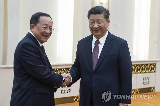 (베이징 AP=연합뉴스) 중국을 방문 중인 리용호 북한 외무상(왼쪽)이 7일(현지시간) 베이징 인민대회당에서 시진핑 중국 국가주석과 악수하고 있다. 시 주석은 이날 리 외무상을 만나 "중국은 지난날과 다름없이 남북의 관계개선과 화해협력 추진을 지지한다"고 말했다.