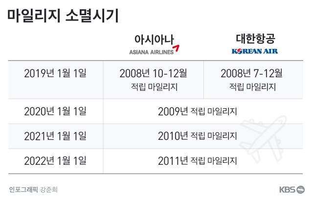 2009년에 적립한 마일리지는 2019년까지 다 쓰지 않으면 2020년 1월 1일 사라진다. 2010년 적립 마일리지는 2021년 1월 1일에 사라진다.