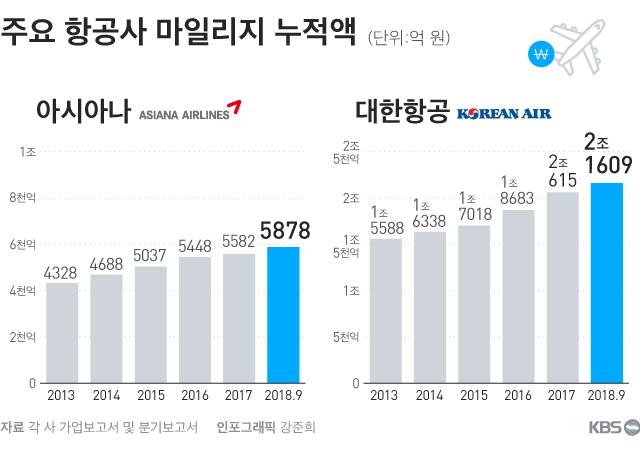 지난 9월 말 기준 대한항공에는 2조 1,609억 원, 아시아나항공에는 5,878억 원의 고객 마일리지가 쌓여 있다.