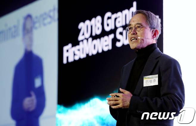 (서울=뉴스1) 박정호 기자 = 김형중 고려대학교 정보보호대학원 교수가 10일 오후 서울 여의도 전경련회관에서 열린 2018 그랜드 퍼스트무버 서밋에서 성공적 암호화폐 세상 만들기를 주제로 강연을 하고 있다.