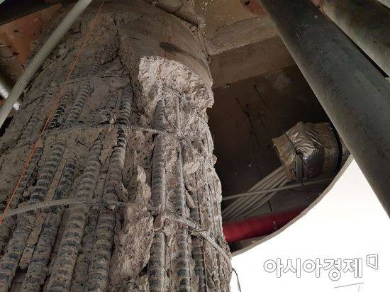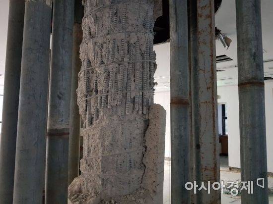 2층으로 들어서자 지지대로 둘러싸인 기둥이 보였다. 콘크리트가 부서져 내부 철근이 그대로 드러난 기둥은 한눈에 보기에도 위태로운 모습이었다. 기둥 주변의 바닥은 가뭄에 쩍쩍 갈라진 논바닥처럼 군데군데 금이 가 있었다.