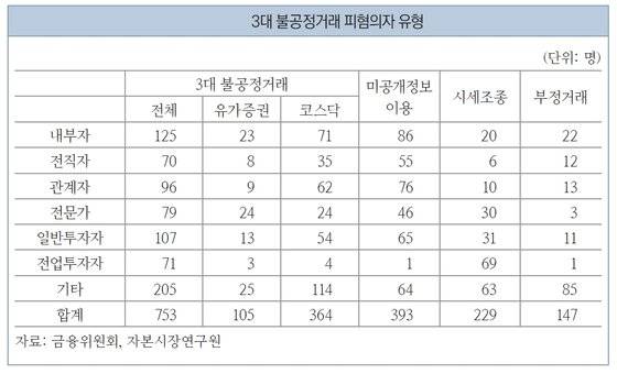 이 기간 코스피ㆍ코스닥 시장에서 ▶미공개 정보 이용 ▶시세 조종(주가 조작) ▶부정 거래(시세 변동을 노린 허위 사실 유포, 협박과 폭행 등) 혐의로 피의자 신분이 된 사람은 모두 753명이었다.