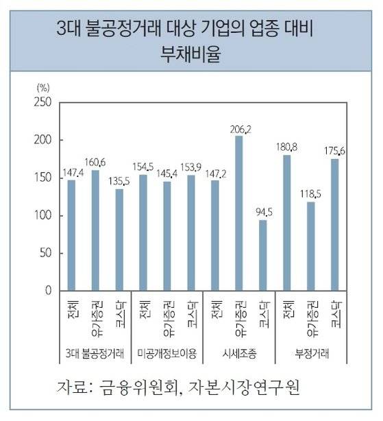 보고서에 따르면 불공정 거래 대상이 된 기업의 총자산은 같은 업종 대비 평균 72.6% 수준에 머물렀다. 부채 비율도 동일 업종과 비교해 47.4%포인트 높게 나타났다. 수익성도 업계 평균에 비해 나빴다.