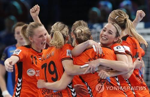 The Netherlands players celebrate after winning the Women's European Handball Championship bronze medal match between Romania and the Netherlands in Paris, Sunday, Dec. 16, 2018. (AP Photo/Michel Euler)