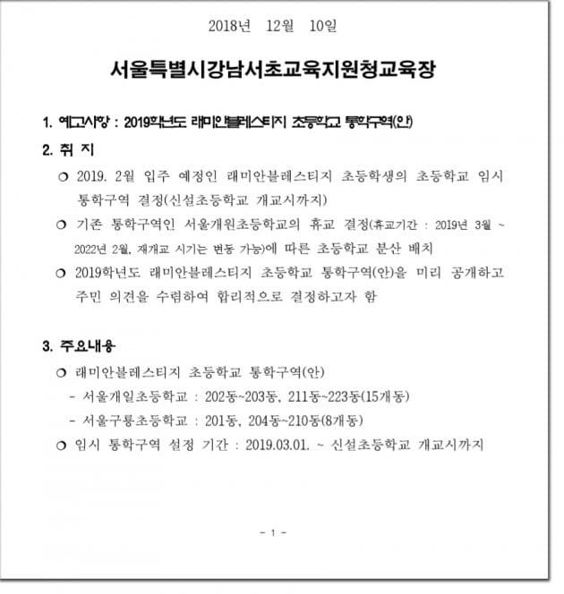 두 단지가 학군을 놓고 고민에 들어간 것은 재건축으로 기존보다 주민 수가 많아지는데도 인근 초등학교는 오히려 줄어든 까닭이다. 래미안블레스티지는 기존 1400가구 개포주공2단지를 1957가구로 늘린다. 입주 가구가 40% 가까이 증가하는 셈이다. 개포시영을 재건축하는 래미안포레스트는 기존 1970가구에서 2296가구로 330여 가구가 늘어난다. 반면 두 단지 인근 개원초는 다음달부터 휴교에 들어간다. 재건축 중인 개포주공1단지 안에 있어 단지 철거·착공 시기에 맞춘 결정이다. 일대 학생들은 2022년 2월 개원초가 재개교하거나 개포주공1단지 내 신설 초등학교가 문을 열 때까지 기존 학교에 나눠 배정된다.