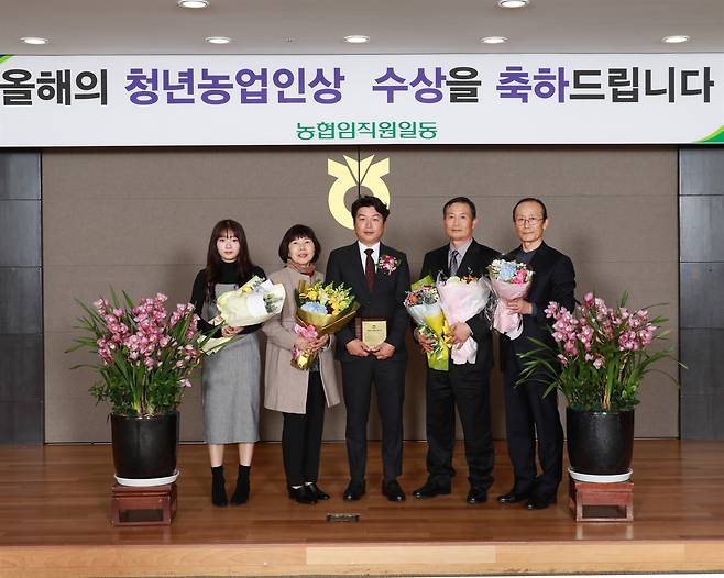 | ▲ ▲ 박덕영 씨가 지난 2일 올해의 청년 농업인상을 수상한 가운데, 가족들과 기념사진을 찍고 있다. |