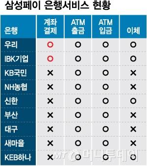 다른 은행들도 삼성페이를 통한 계좌 결제 서비스 도입을 검토했지만 사업성이 불투명하다는 이유로 접었다. 신한·KB국민·KEB하나·NH농협은행 등은 삼성페이를 통한 자금 이체와 ATM(자동입출금기) 거래 서비스만 내놓았을 뿐 결제 기능은 뺐다. 한 시중은행 관계자는 “체크카드 결제와 겹치고 이미 계좌 결제를 시작한 은행들의 실적도 좋지 않아 굳이 도입할 이유를 찾지 못했다”고 말했다.