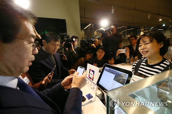 (서울=연합뉴스) 이지은 기자 = 박원순 서울시장이 20일 오전 서울 중구에 위치한 한 카페에서 서울시 제로페이 결제시연을 하고 있다. 제로페이는 매장에 비치된 전용 QR코드를 기존 은행이나 간편결제 애플리케이션(앱)으로 찍으면 소비자 계좌에서 판매자 계좌로 대금이 이체되는 모바일 직거래 결제 시스템이다. 2018.12.20