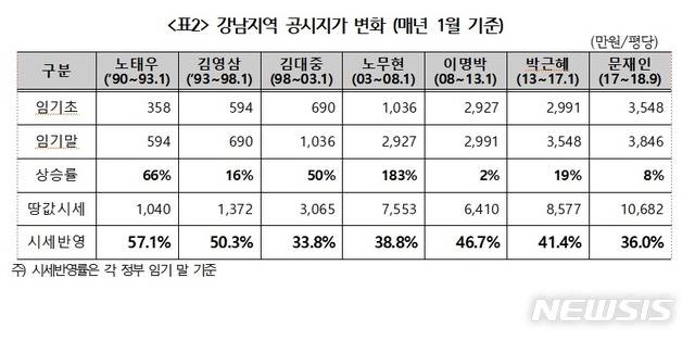 역대 정권별 강남3구 주요 아파트 시세반영률은 임기 마지막해 기준 ▲노태우 정부(1993년) 57.1% ▲김영삼 정부(1998년) 50.3% ▲김대중 정부(2003년) 33.8% ▲노무현 정부(2008년) 38.8% ▲이명박 정부(2013년) 46.7% ▲박근혜 정부(2017년) 41.4% 등이다.