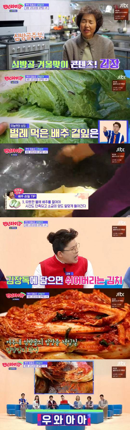 심방골 주부는 김치 절이기 꿀팁을 공개했다. 따뜻한 물에 소금을 풀어 배추를 절이라는 것. 그 이유는 소금이 덜 들어가고, 소금이 많이 들어가면 쓴맛이 난다고 했다. 다음날 잘 절여진 배추에 고춧가루 양념을 묻힐 시간. 꼭지를 미리 제거하는 것은 양념이 잘 스며들게 하기 위한 것. 양념이 잘 묻혀진 배추를 가르는 소리는 스튜디오의 환호를 유발했다.