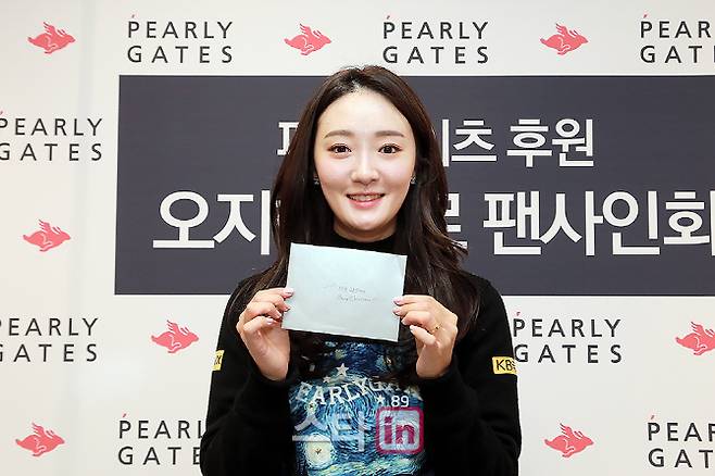 [이데일리 골프in 박태성기자] 올해 KLPGA 2승과 대상포인트 2위, 평균퍼팅 1위를 차지한 오지현(22.KB금융그룹)이 22일 오후 서울 종로구 소재 롯데백화점 본점에서 '파리게이츠 후원 오지현프로 팬사인회'를 가졌다. 오지현이 찾아 온 팬에게 크리스마스 카드를 선물 받고 있다.