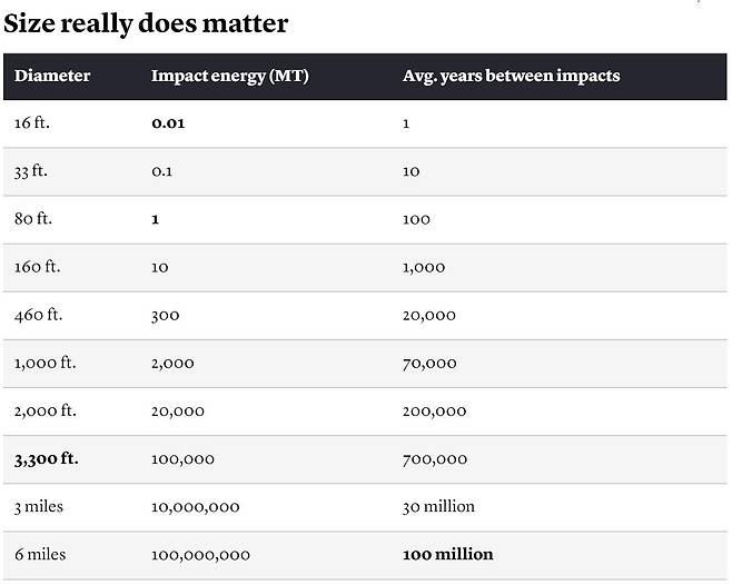 이에 따라 최근 미국 과학매체 파퓰러사이언스는 과학자들에게 자문한 뒤 소행성 지름에 따른 충돌 에너지와 이런 소행성이 얼마나 자주 지구에 떨어질 수 있는지를 공개했다.