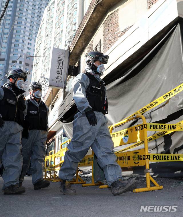 【서울=뉴시스】김온유 기자 = 서울 강동구 천호동 성매매업소 화재에 대한 2차 합동감식이 24일 실시됐다.