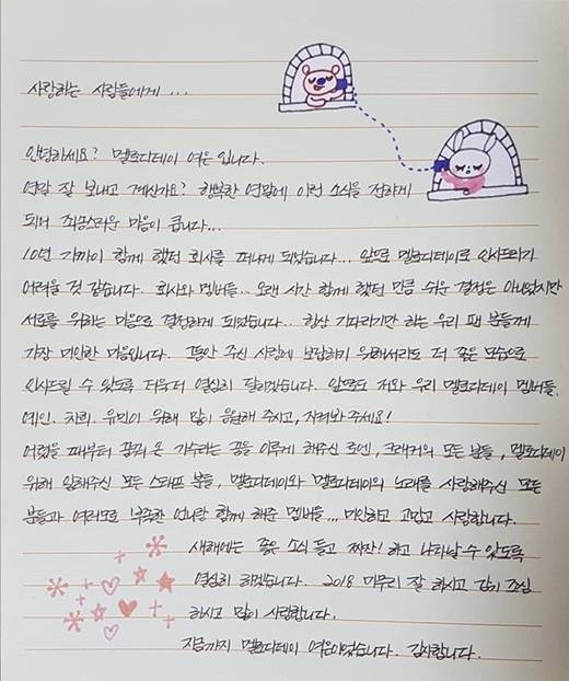 연말 잘 보내고 계신가요? 행복한 연말에 이런 소식을 전하게 되어 죄송스러운 마음이 큽니다. 10년가까이 함께 했던 회사를 떠나게 되었습니다. 앞으로 멜로디데이로 인사드리기 어려울 것 같습니다. 회사와 멤버들 오랜 시간 함께 했던 만큼 쉬운 결정은 아니었지만 서로를 위하는 마음으로 결정하게 되었습니다. 항상 기다리기만 하는 우리 팬 분들께 가장 미안한 마음입니다. 그동안 주신 사랑에 보답하기 위해서라도 더 좋은 모습으로 인사드릴 수 있도록 더욱더 열심히 달리겠습니다.