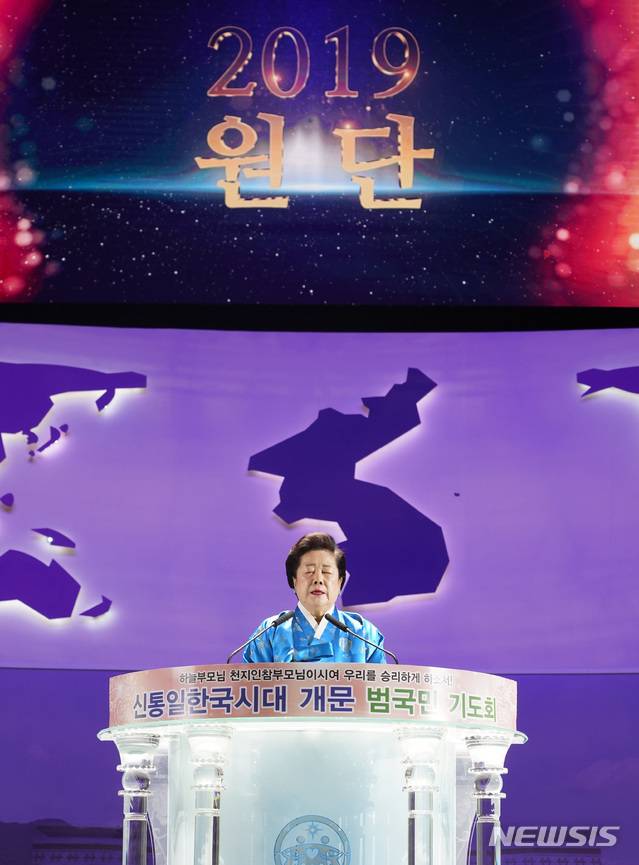 【서울=뉴시스】김진아 기자 = 기해년(己亥年)을 맞아 1일 새벽 경기도 가평 청심평화월드센터에서 열린 세계평화통일가정연합, ‘신통일한국시대 개문 범국민 기도회’에서 한학자 총재가 신년축도를 하고 있다. 2019.01.01. (사진=세계평화통일가정연합 제공)