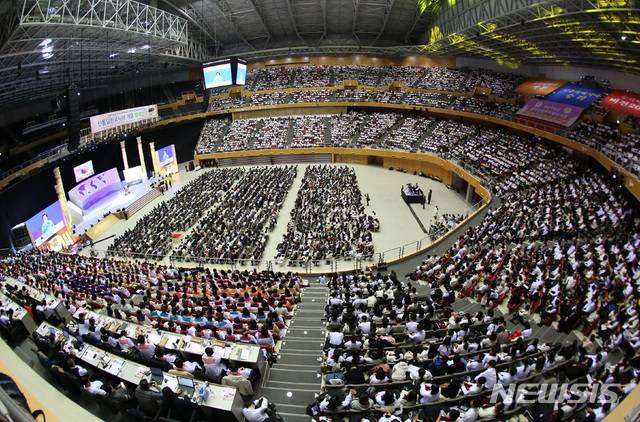 【서울=뉴시스】김진아 기자 = 기해년(己亥年)을 맞아 1일 새벽 경기도 가평 청심평화월드센터에서 세계평화통일가정연합, ‘신통일한국시대 개문 범국민 기도회’가 열리고 있다. 2019.01.01. (사진=세계평화통일가정연합 제공)