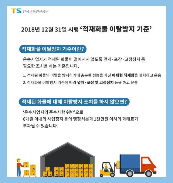 기준에 따라 화물차는 적재화물 이탈 방지를 위한 폐쇄형 적재함을 설치해 운송하거나 적재함을 이용해 운반하기 어려운 화물은 덮개·포장을 하고 고정장치를 이용해 충분히 고정시킨 후에 운행해야 한다.